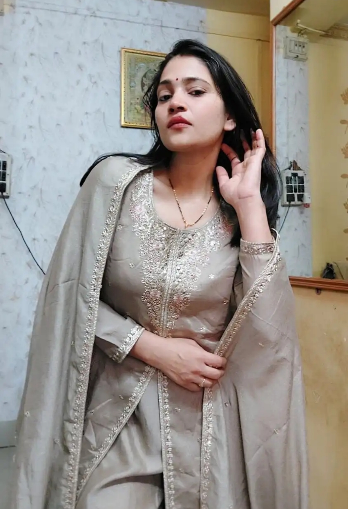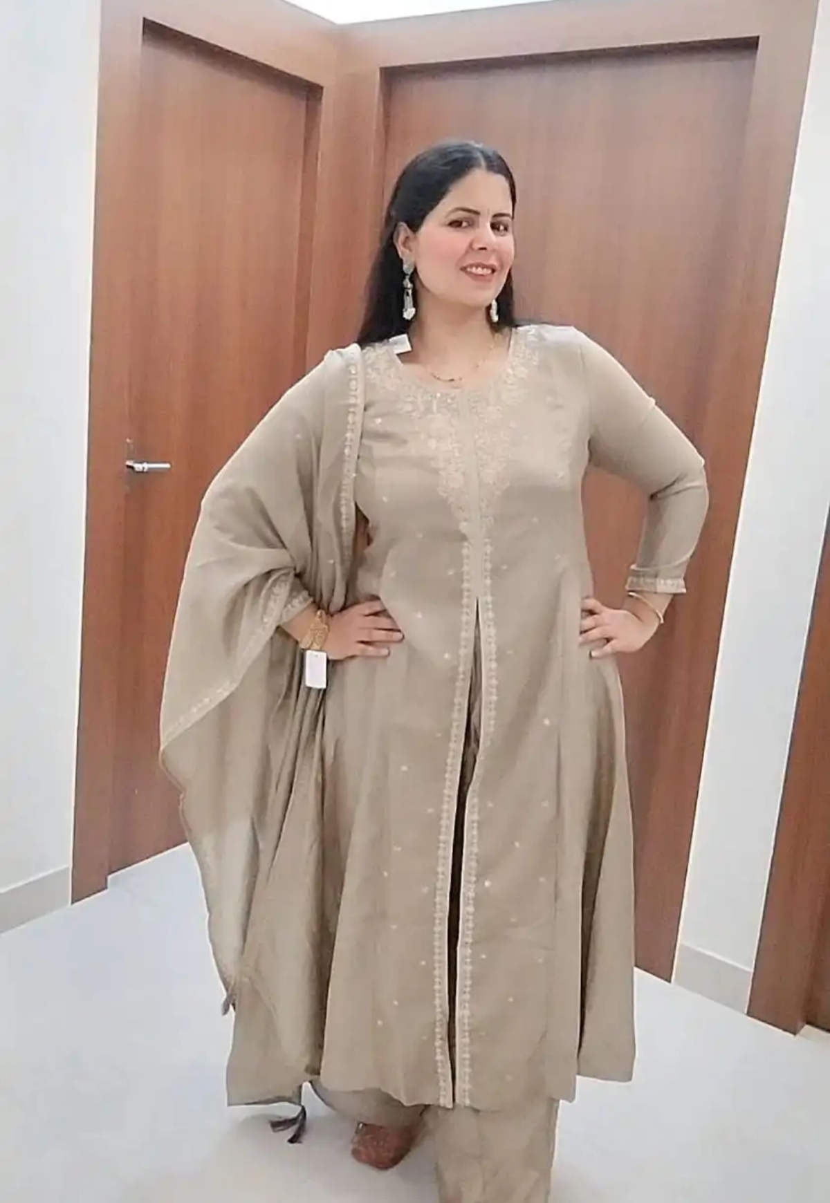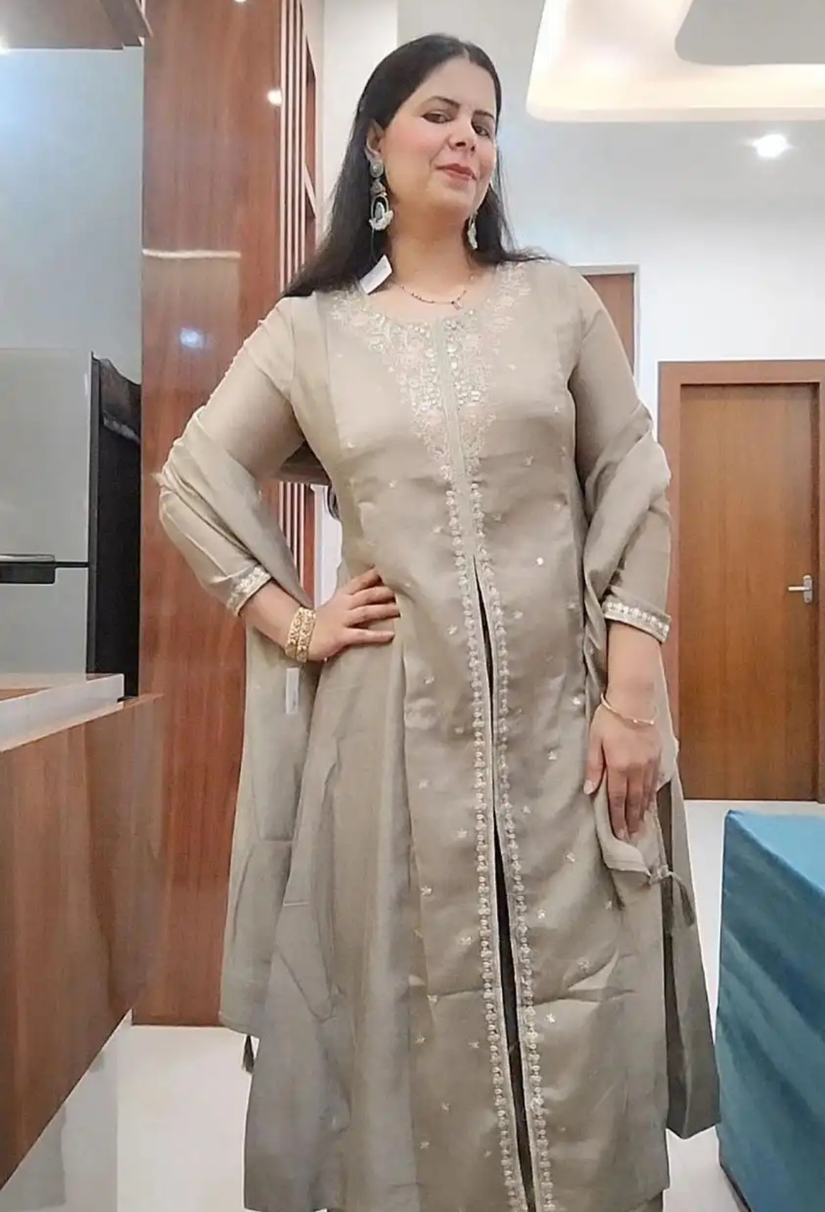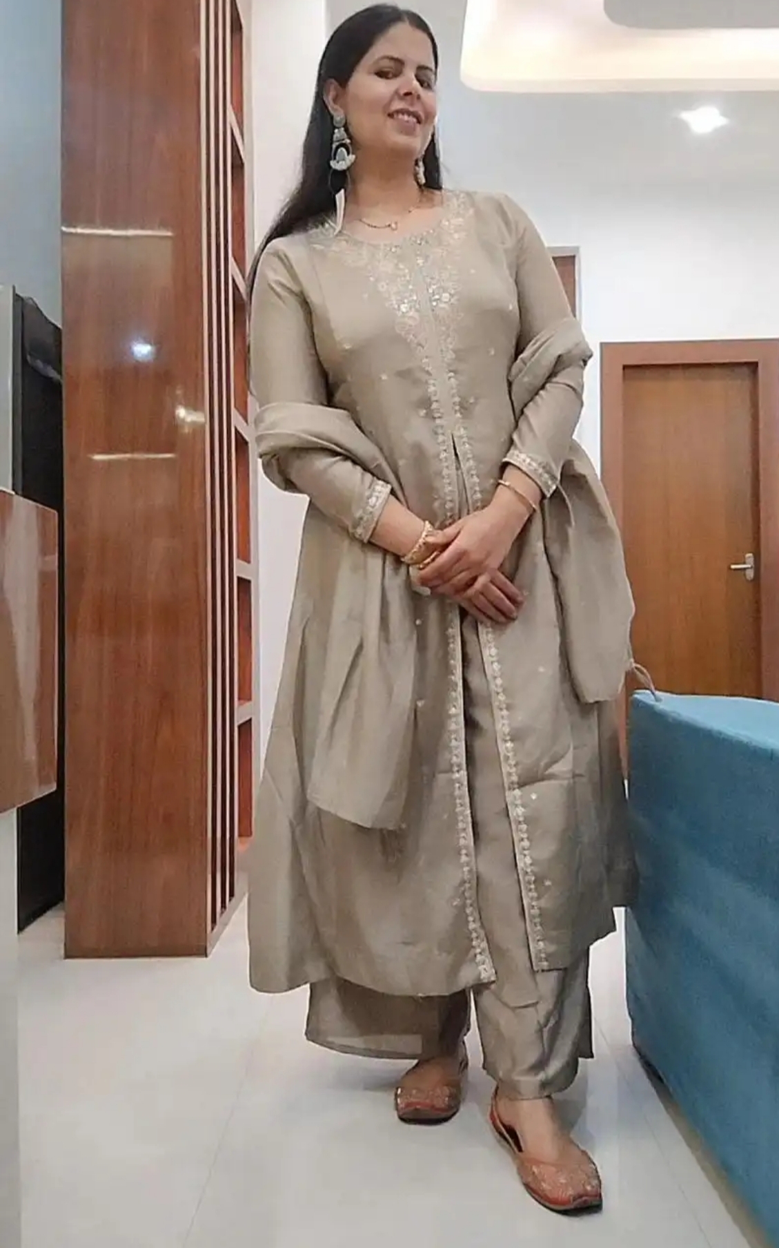 Whether you are attending a grand wedding reception, a festive puja, or a special evening celebration, this Grey Anarkali set guarantees you will leave a lasting impression.