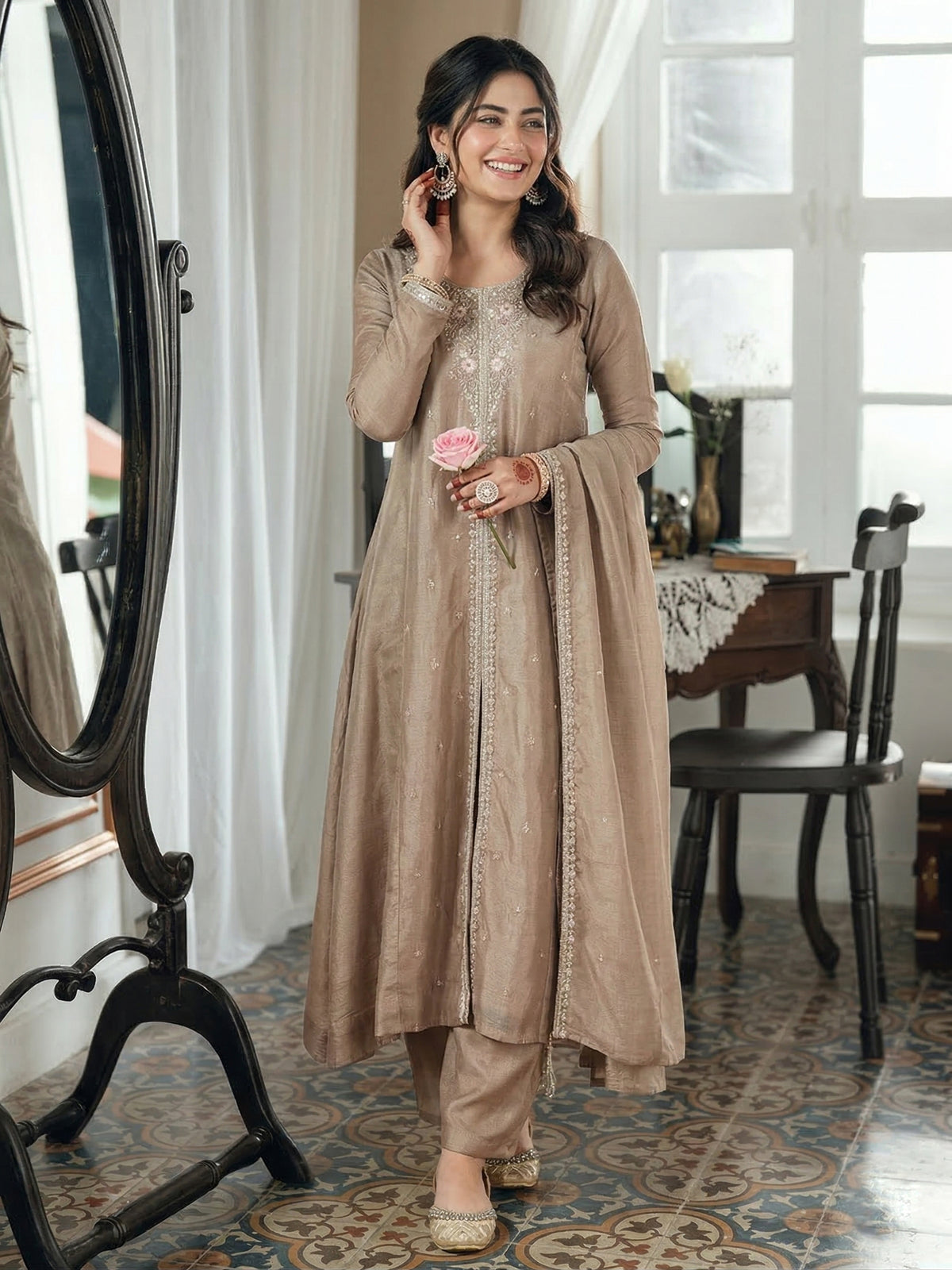Crafted from rich, high-quality Silk fabric, this outfit features a beautifully flowy Anarkali silhouette that flatters every body shape. The bodice is adorned with intricate embroidery, perfectly complemented by a classic Round Neckline and elegant Full Sleeves. Falling gracefully to an ankle length, this kurta is paired perfectly with a delicate, matching dupatta to complete your majestic look.