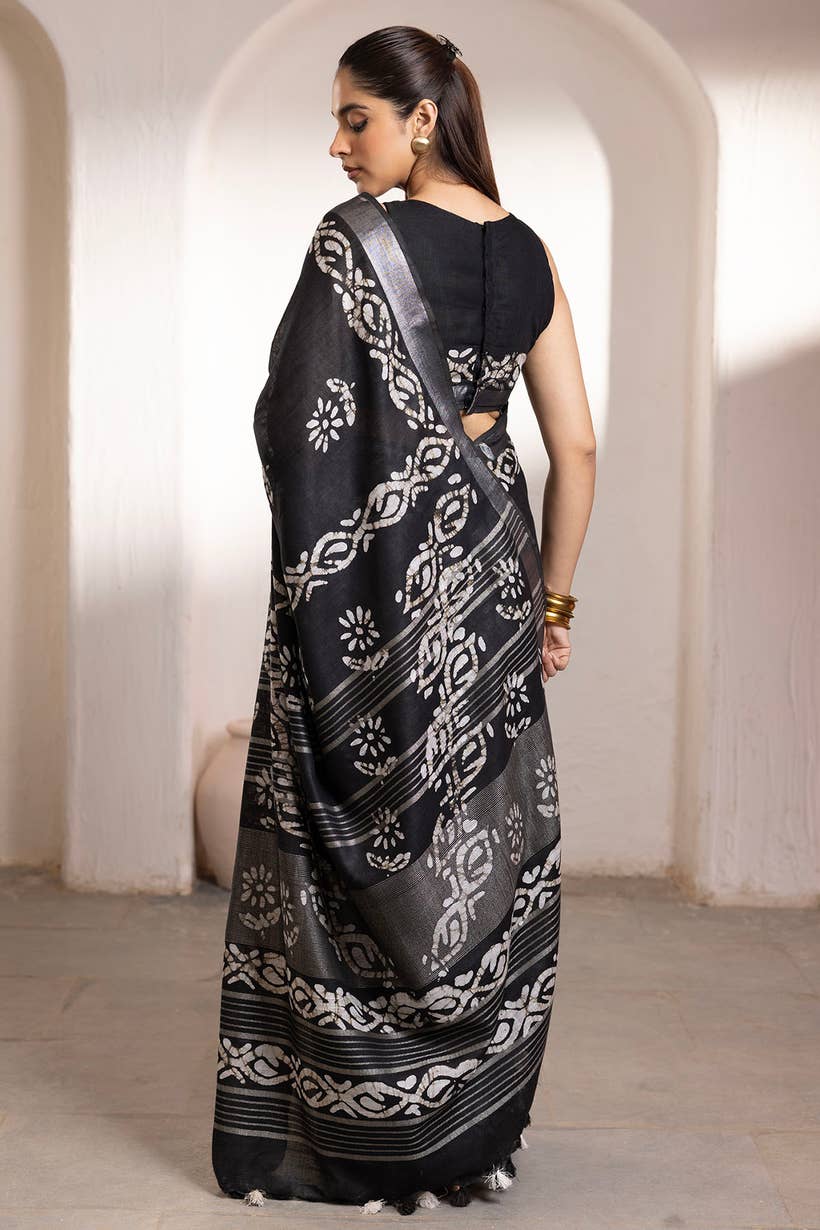 Crafted from premium, breathable linen, this saree ensures you stay comfortable throughout the day without compromising on flair. It features a classic Batik print that adds depth and artistic grace to the deep black canvas. The beautifully detailed tassels on the pallu give the outfit a unique, playful touch that effortlessly stands out.