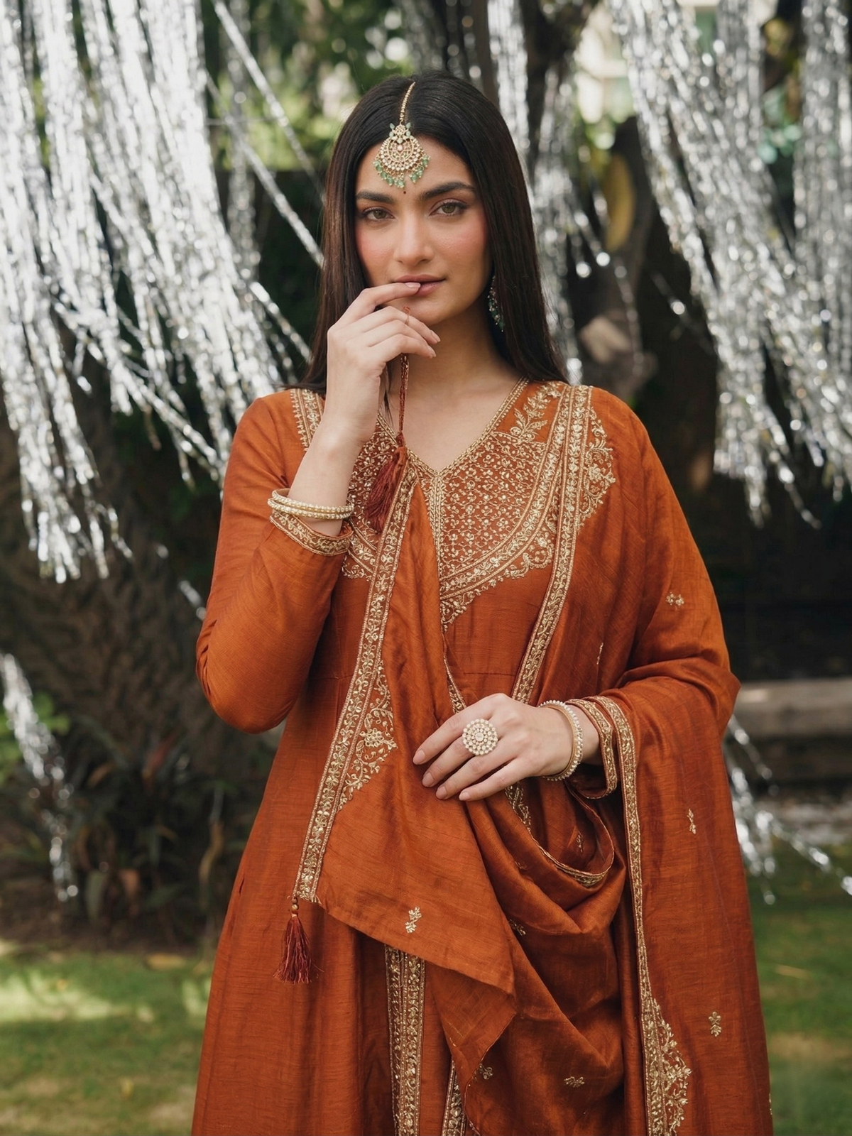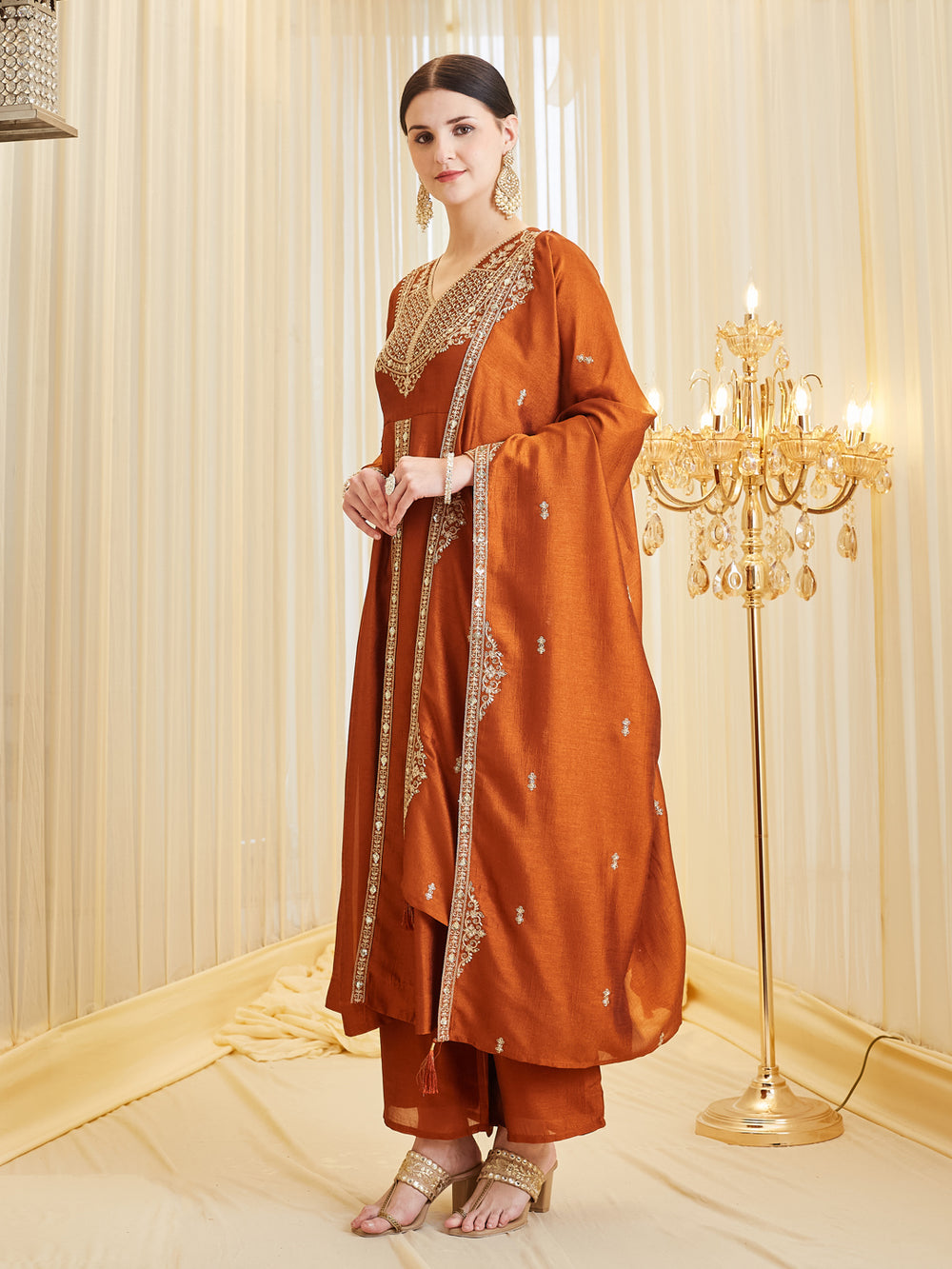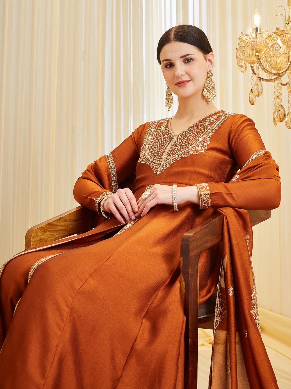 • Model wearing a premium orange silk embroidered Anarkali kurta featuring a V-neck and full sleeves, paired with a matching dupatta, perfect for festive wear and weddings.
