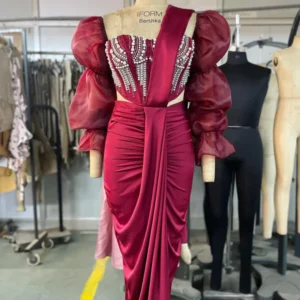 Crafted from sumptuous Burgundy Armani Satin, this saree feels incredibly soft against your skin and drapes with a rich, fluid grace. It’s fully lined to ensure a flawless and smooth fit, letting you move with complete confidence.
