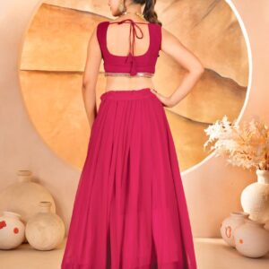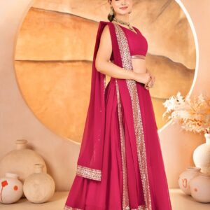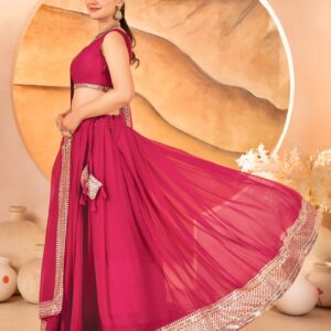 Crafted from luxurious Faux Blooming fabric, this lehenga choli boasts exquisite embroidered sequins work that shimmers beautifully with every move, capturing the light and every admiring glance. The vibrant Pink hue adds a touch of playful elegance, perfect for a lively and memorable occasion.