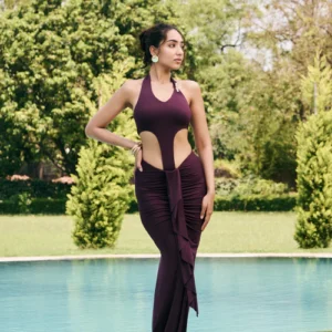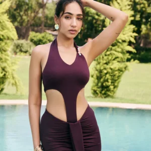 Elina’s head-turning details are what truly set her apart. The elegant halter neck bodysuit design creates a sleek, elongated silhouette, drawing attention upwards. Below, a truly dramatic, long cut-out front panel gracefully cascades down, offering maximum movement and an irresistible allure with every step. Adding just the right amount of shimmer is a delicate bead embellishment on one side of the strap, ensuring you sparkle and captivate without overwhelming the design.