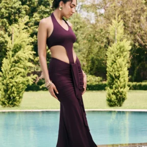 Elina Plum Modal Draped Top with halter neck and cut-out panel