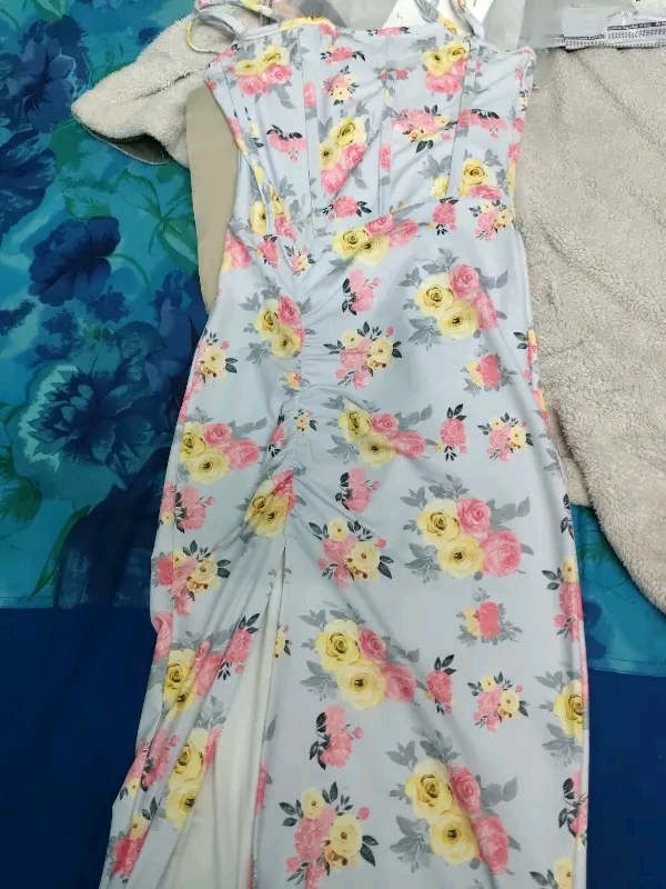 We designed it with flattering ruched detailing down the front, creating a stunning contour that celebrates your figure. The daring thigh-high slit adds a dramatic flair and just the right amount of allure, making it perfect for turning heads. The light blue base with a classic pink and yellow floral print makes it timeless.