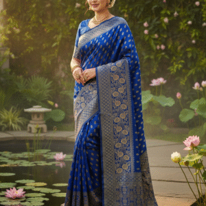 It comes with an unstitched matching Blue Polysilk Blouse (0.80 Mtr) featuring elegant Jacquard Border and self-woven detailing, allowing you to tailor a perfect fit.